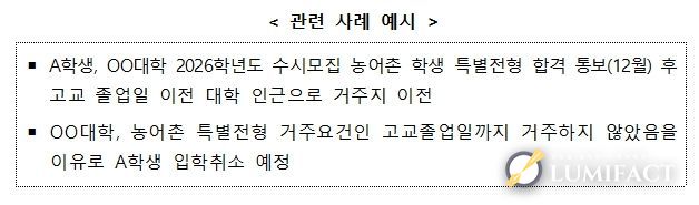 루미팩트 백라희 기자 | 교육부는 ‘농어촌 학생 특별전형’ 자격요건과 관련하여 대입현장에서 반복적으로 발생하는 불합리한 사례를 해소하기 위한 적극행정조치 및 제도개선을 시행할 계획이라고 밝혔다.