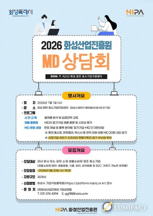 루미팩트 백라희 기자 | 화성산업진흥원(원장 전병선)은 화성시 생활소비재 기업의 대형 유통망 진입과 신규 판매채널 확보를 지원하기 위해 ‘2026년 화성산업진흥원 MD 상담회’를 개최하고, 오는 5월 20일까지 참여기업을 모집한다.