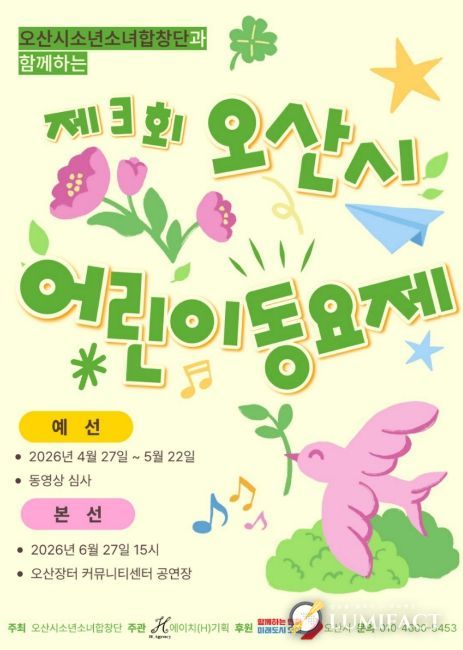 참가 대상은 오산시에 거주하는 7세 어린이부터 초등학생까지 동요를 좋아하는 아동이며, 참가비는 무료다. 예선 심사를 통해 선발된 총 15개 팀이 본선 무대에 오른다.