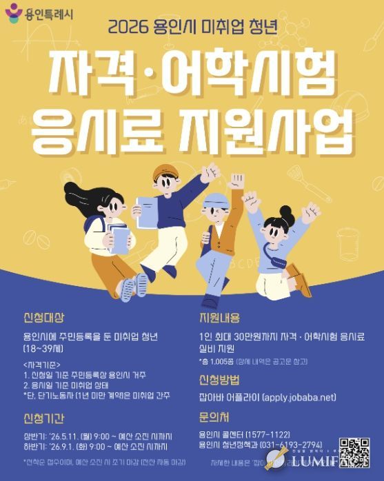 루미팩트 백라희 기자 | 용인특례시는 취업을 위해 어학과 자격증 시험 등을 준비 중인 청년을 위해 응시료 30만 원을 지원한다고 30일 밝혔다.