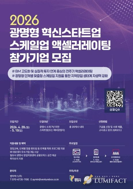 시는 오는 5월 10일까지 ‘2026년 광명형 혁신스타트업 스케일업 액셀러레이팅’ 참가기업을 모집한다.