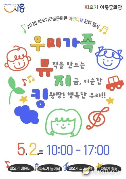 루미팩트 백라희 기자 | 시흥시 따오기아동문화관은 어린이날을 맞아 오는 5월 2일 오전 10시부터 오후 5시까지 따오기아동문화관 야외 일대에서 2026년 어린이날 문화행사 ‘우리가족 뮤지킹’을 개최한다.