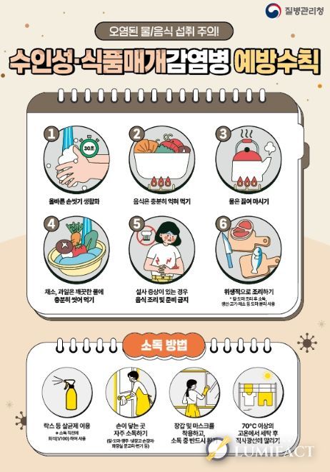 수인성ㆍ식품매개감염병은 병원성 세균, 바이러스, 원충에 오염된 물이나 식품을 섭취해 구토, 설사, 복통 등의 장관 증상을 유발한다. 이를 예방하기 위해서는 ▲올바른 손 씻기 생활화 ▲음식 충분히 익혀 먹기 ▲물 끓여 마시기 ▲채소ㆍ과일 깨끗한 물에 충분히 씻어 먹기 ▲설사 증상 시 음식 조리 및 준비 금지 ▲위생적으로 조리하기 등 예방수칙을 준수해야 한다.