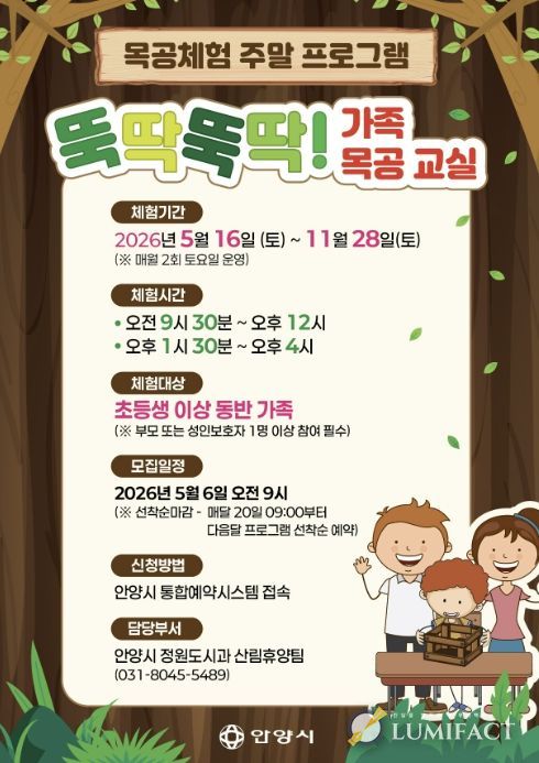 루미팩트 이아린 기자 | 안양시는 초등학생과 가족이 함께 참여할 수 있는 목공체험 주말 프로그램인 ‘뚝딱뚝딱! 가족 목공 교실’을 운영한다고 30일 밝혔다.