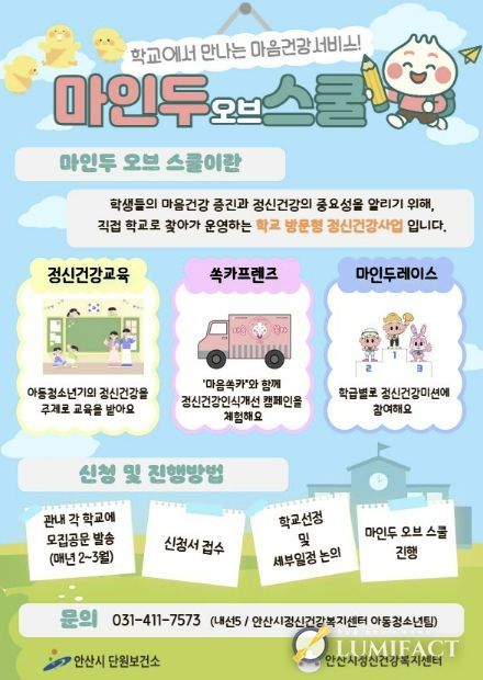 루미팩트 이아린 기자 | 안산시 정신건강복지센터는 11월까지 관내 초·중·고등학교 총 10개교를 대상으로 학교로 찾아가는 정신건강사업 ‘마인두 오브 스쿨’을 운영한다고 30일 밝혔다.