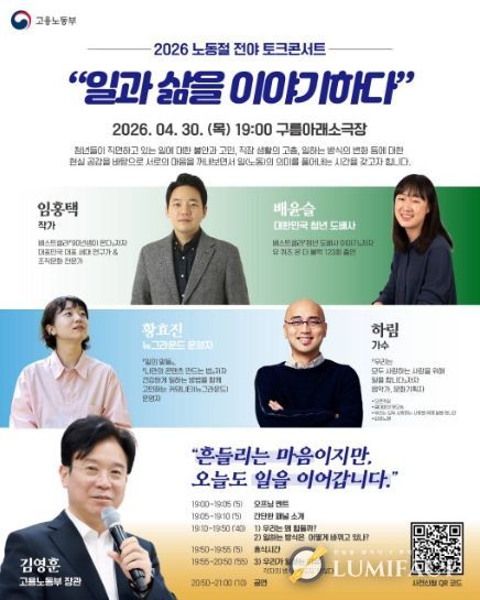루미팩트 백라희 기자 | 고용노동부는 4월 30일 저녁 7시, 서울 마포구 소재 ‘구름아래소극장’에서 청년 200여 명과 함께 일에 대한 고민을 나누며, 노동의 가치를 다시 한번 생각해 보는'일과 삶을 이야기하다' 토크콘서트를 개최했다고 밝혔다.