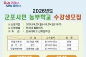 루미팩트 이아린 기자 | 군포시 도시농업 활성화 지원사업 보조사업자인 한세대학교가 오는 3월 20일까지 2026년도 군포시민 농부학교 신규 수강생을 모집한다고 밝혔다. 군포시민 농부학교는 군포시민들이 도심 속에서 직접 작물을 재배하며 친환경적인 삶의 태도를 함양하고, 이웃과 소통하는 공동체 문화를 회복하기 위해 마련됐다. 특히 단순한 농사 기술 습득을 넘어 이론과 실습이 병행된 체계적인 커리큘럼을 제공할 예정이다. 올해 모집 규모는 성인반 25구좌, 주말가족반 25구좌, 주말어린이반 20구좌로 총 70구좌이며, 교육은 한세대학교 내 위치한 도시농업지원센터 전용 농장에서 진행된다. 운영 기간은 3월부터 12월까지 약 10개월간이며 총 20강에 걸쳐 절기별 작물 재배법과 생태 교육 등 다채로운 프로그램이 이어진다. 신청 접수는 3월 9일부터 3월 20일까지 진행되며 자세한 커리큘럼 및 접수 방법은 한세대학교 홈페이지 공지사항을 통해 확인할 수 있다. 군포시 관계자는 “도시농업은 먹거리를 생산하는 즐거움을 넘어 기후 위기 시대에 탄소 중립을 실천하는 소중한 발걸음이 될 것”이라며 “많은 시민이 흙을 만지